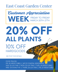We are celebrating YOU with a week full of discounts and food trucks! Starting Friday, March 20th through Friday, March 27th – all plants are 20% OFF and all hardgoods are 10% OFF!