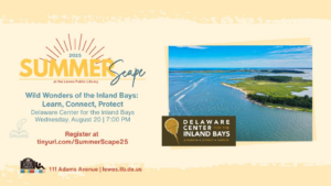 “Get your feet wet” with Delaware’s Inland Bays! Join Lisa Swanger, Director of Outreach & Education at the Delaware Center for the Inland Bays, for a fun and interactive presentation exploring the amazing habitats and wildlife that call the Bays home. Discover how this unique ecosystem supports both wildlife and our communities, some of the challenges it faces, and simple ways—even the smallest hands—can help protect this natural treasure. This presentation is perfect for curious kids, nature-loving families, and anyone ready to dive into the wonders of the Inland Bays!The mission of the Delaware Center for the Inland Bays is to preserve, protect, and restore Delaware’s Inland Bays and their watershed. The Center achieves this through science-based: research, restoration, education, outreach, public policy, and advocacy.