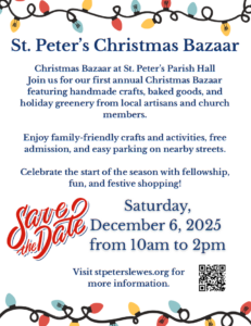 Crafters, bakers, and decorators from the church and local community will provide a variety of items for sale including hand made crafts, baked goods, and holiday greenery. Seasonal crafts and activities will be available for families with children including a visit from St. Nicholas and his elves.